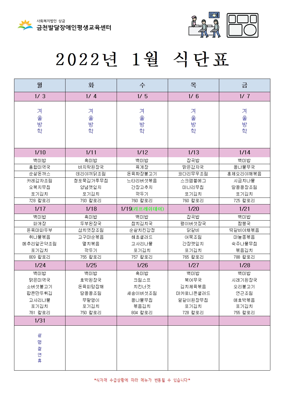 2022년 1월 급식 식단표 안내해드립니다.