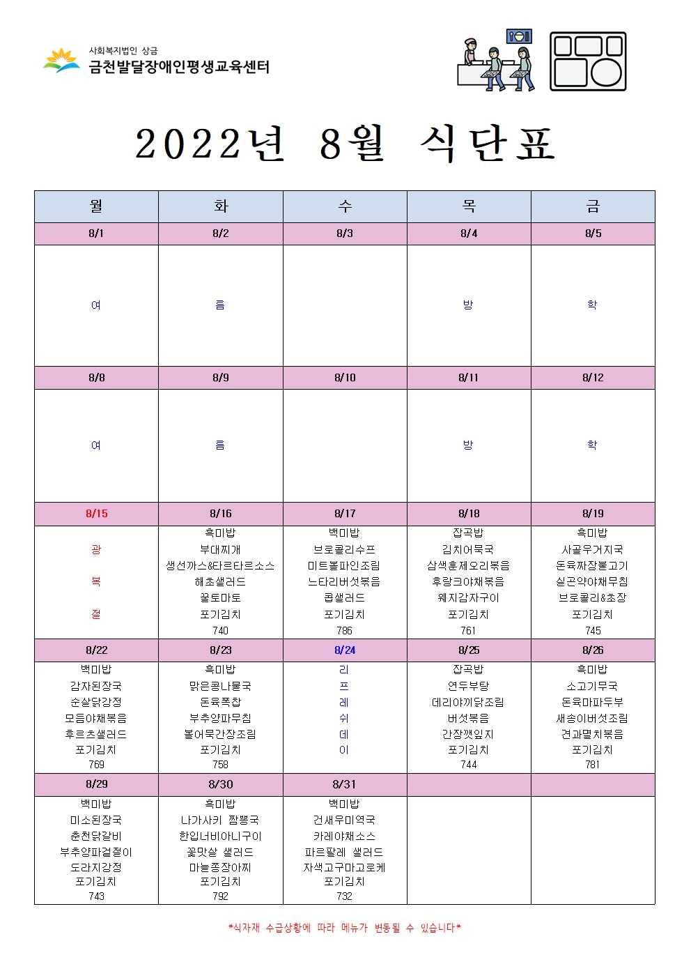 2022년 8월 급식 식단표 공지