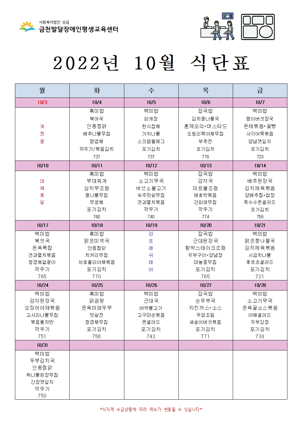 2022년 10월 급식 식단표 공지