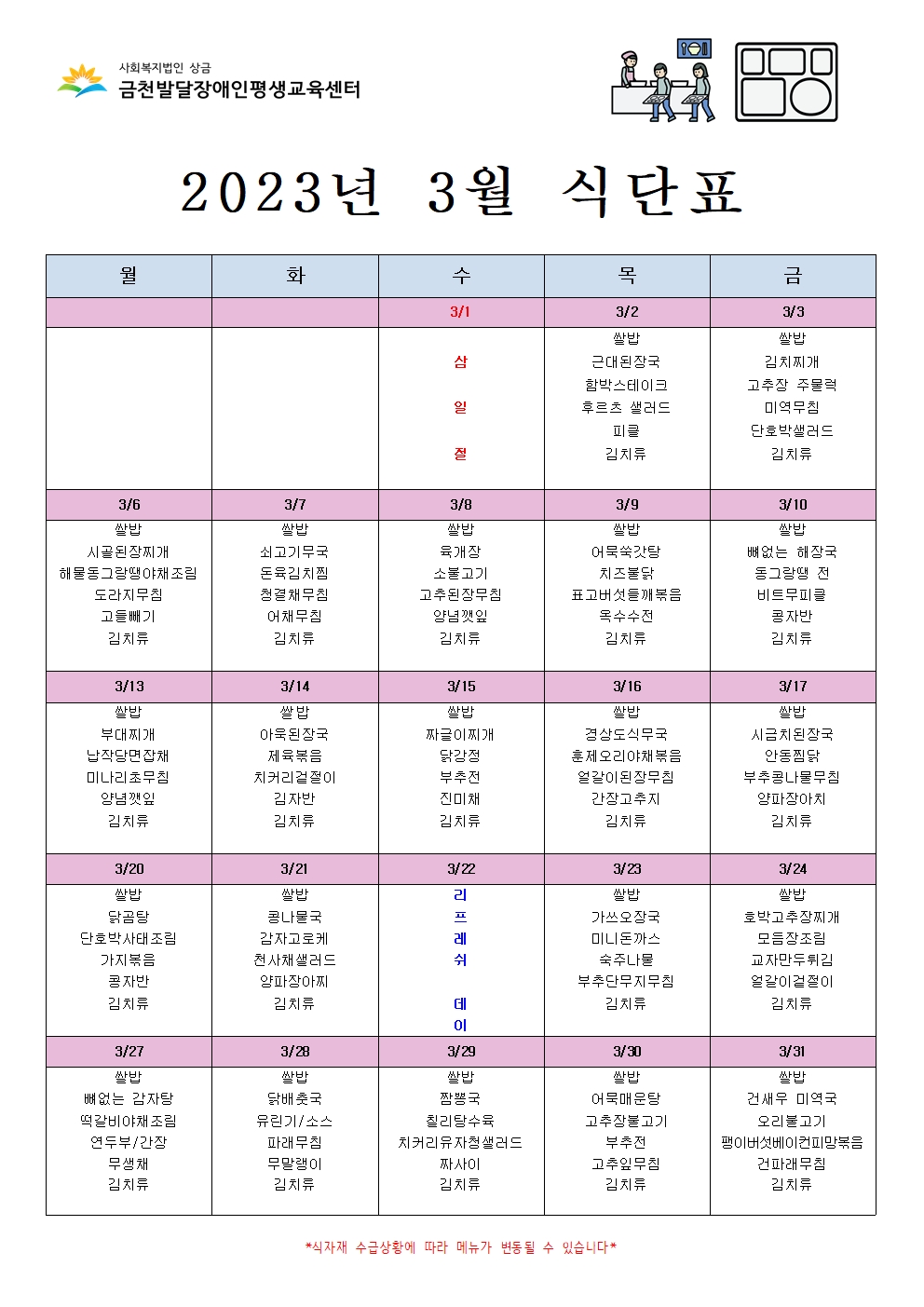 2023년 3월 급식 식단표 공지 합니다.