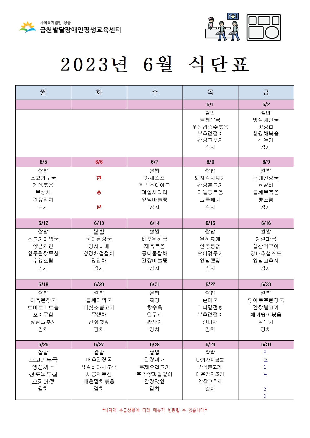 2023년 6월 급식 식단표 입니다.