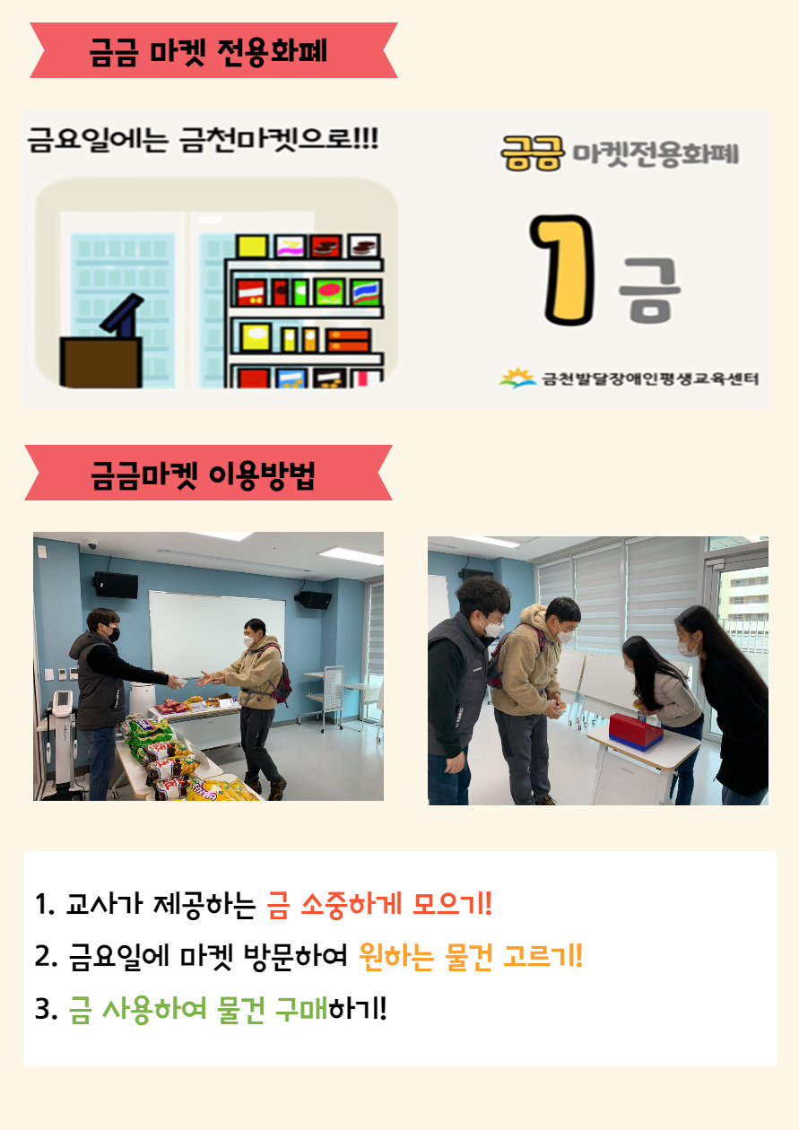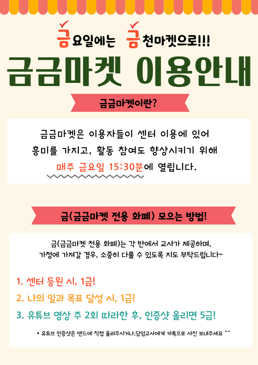 금금 마켓은 이용자들이 센터 이용에 있어 흥미를 가지고 활동 참여도를 향상 하기 위해 2월 5일(금)에 오픈하였습니다.