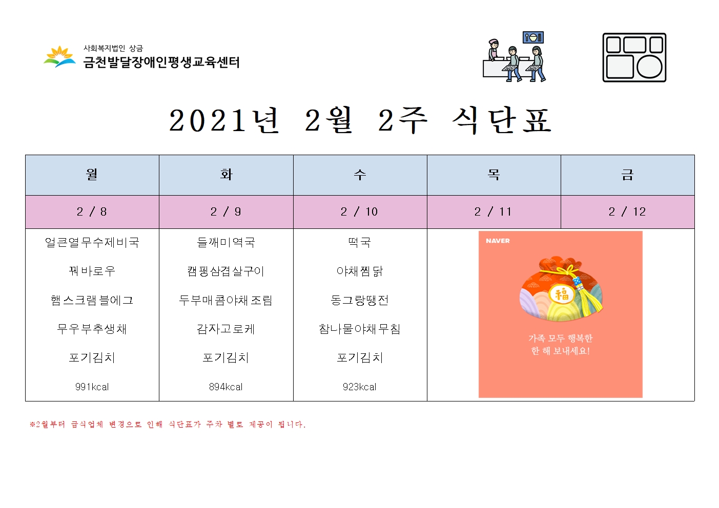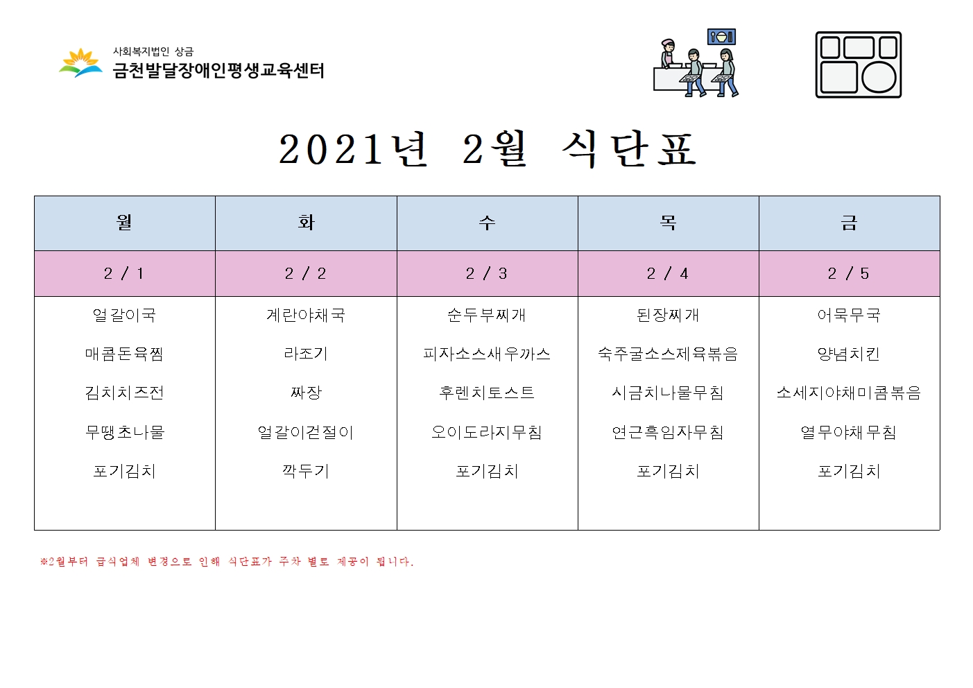 2월 1, 2주 식단표 공지 합니다.