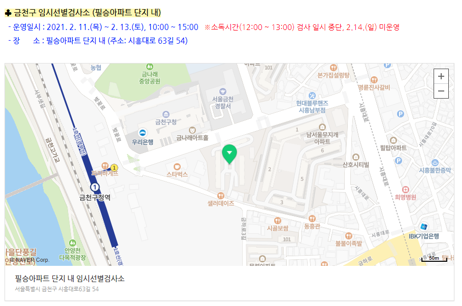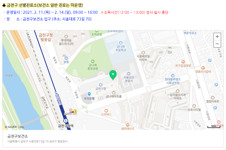 설 연휴기간 동안 금천구 선별진료소 및 임시선별검사소 운영시간을 참고해주세요.
