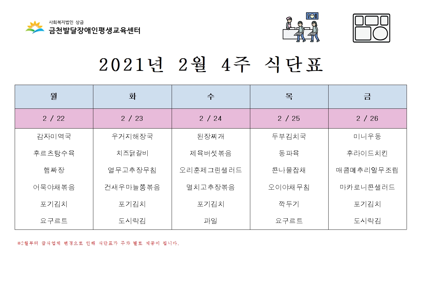 2월 4주 식단표 안내드립니다.