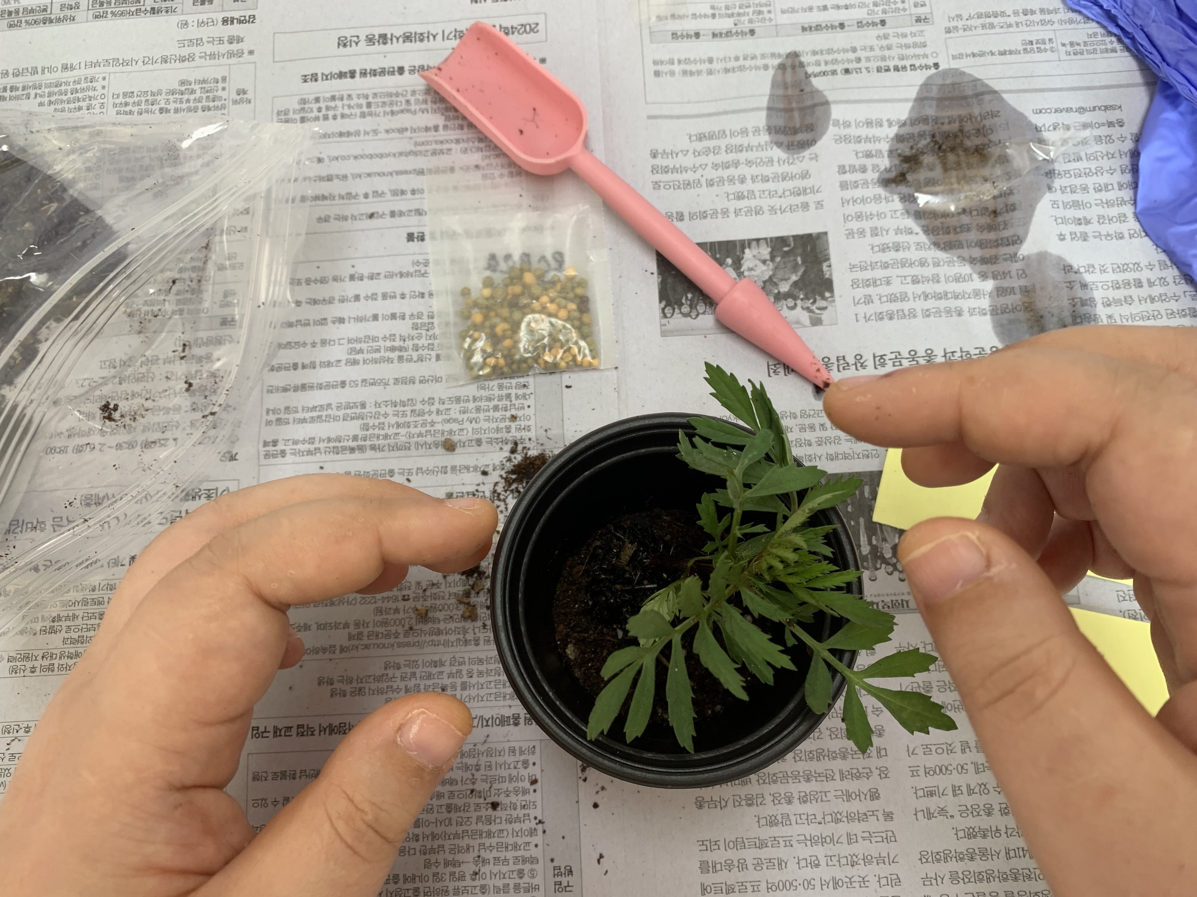 메리골드 모종도 흙을 담아 꾹꾹 심어보며